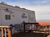 This unit is located at the front of the Lodge up on the hill middle end of the Great Sand Dunes Lodge is an Eagle Camper. This large camper is a unique vacation rental near Alamosa, Colorado. It features a full-size bed, 2 bench bed with dining table. Our Camper Suite is an ideal travel accommodation for a couple but could just as easily accommodate four people. The full kitchen has all the comforts of home including a full-size refrigerator with freezer, microwave, toaster, and electric oven, plus all necessary dishes and utensils. This camper includes a walk-in shower, hair dryer, high-definition television, wireless Internet and heating and air conditioning. Camper is non-smoking.